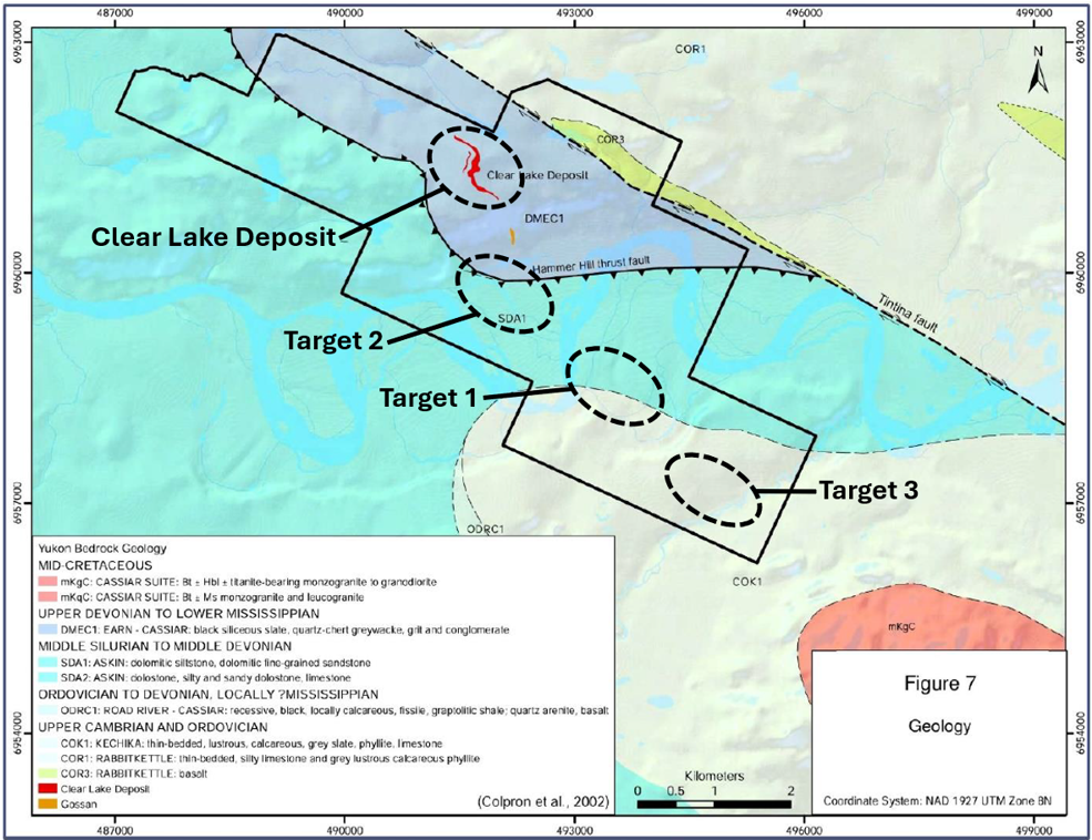 - Target 2: A second EM anomaly on strike with Clear Lake mineralization and adjacent to an outcrop of zinc-rich gossan (iron oxides that result from the weathering of massive sulfides).