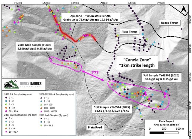HONEY BADGER DISCOVERS NEW “CANELA” ZONE IN KILOMETRE-LONG SILVER-GOLD SOIL ANOMALY AT PLATA, YUKON
