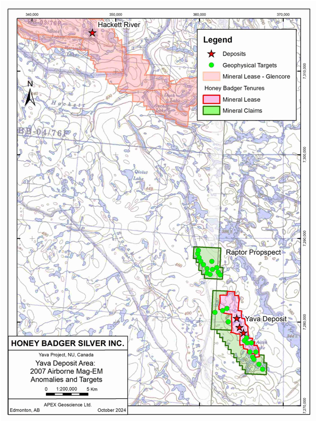 Honey Badger’s CEO, Dorian L. (Dusty) Nicol, commented, “Our new claims provide an important addition to the project’s expansion potential. In addition to its historical silver resource, Yava has tremendous upside exploration potential, which we have enhanced greatly by more than tripling the size of our land position. All of our Yava claims are located near Glencore plc’s (GLCNF) Hackett River project that contains a world-class silver resource of 105 million ounces of silver Indicated and 184 million ounces silver Inferred. Hackett and Yava are located on the same mineralized structure. The number of untested geophysical and geochemical anomalies within our now-enlarged land position speak to the great expansion potential on our claims. We will compile and interpret existing data on the expanded Yava project – which is an exciting new acquisition for Honey Badger – with a view to executing activities to maximize the value of this asset for our shareholders.”