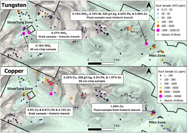 The highest tungsten grade reported is 0.27% WO3, collected in a grab sample from a historic trench in the southern SilverTung zone (Fig. 3). Several other high tungsten values over 0.1% are also from the southern SilverTung zone, with some values >300 ppm sporadically occurring to the north. High tungsten values also overlap with high bismuth values that comprise a ~1.5 km long northwest-southeast trend in the Miko zone, with some elevated tungsten values also in samples to the northwest. Out of 276 samples, 19 contain tungsten grades above 300 ppm, and 6 contain grades over 1,000 ppm.